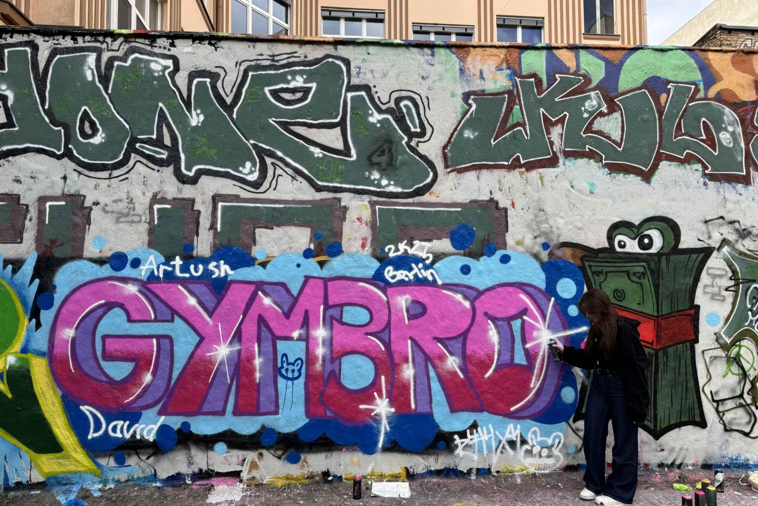 El taller de graffiti incluye todos los materiales: botes de spray ilimitados, cuadernos de bocetos, rotuladores, boquillas y un traje protector con guantes y una pared limpia para pintar. Durante dos horas, crearás tu propia obra maestra, aprenderás nuevas habilidades y conectarás con la dinámica escena artística callejera de Berlín. Sabemos que en Berlín hay muchos talleres de graffiti, a menudo dirigidos por personas que no tienen más conocimientos que los asistentes. A menudo el taller no incluye guantes para eventos ni chaquetas protectoras para no ensuciarse. Pero nosotros estamos dentro y hacemos el taller de graffiti profesionalmente. - Hacemos la escena del graffiti, conocemos las reglas, la cultura, y creemos que los talleres de graffiti deben ser siempre privados para obtener los mejores resultados. ¡Ven y únete a nosotros!