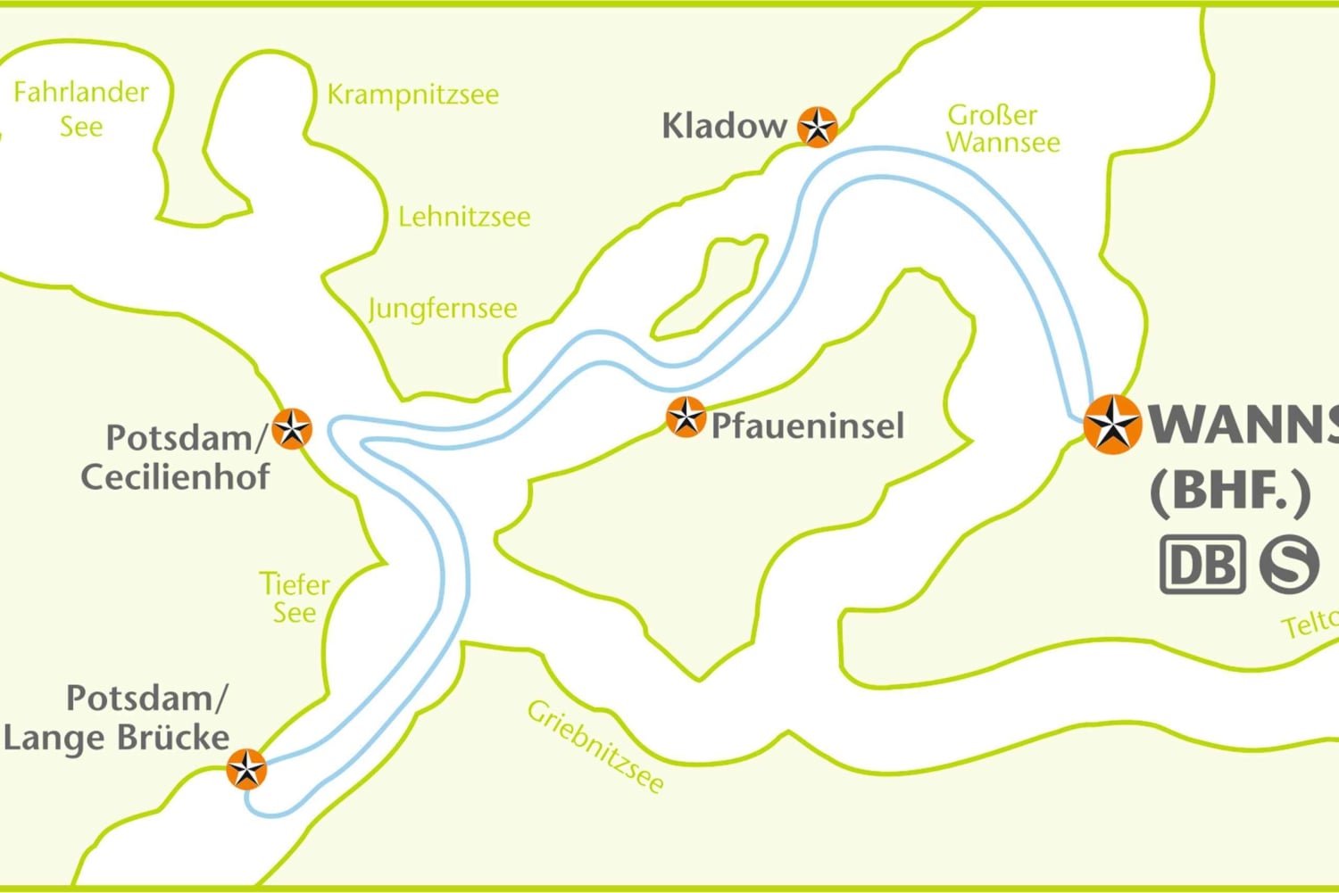 The cruise takes you from Wannsee to Kladow, passing by Pfaueninsel (Peacock Island), Nikolskoe, and the Church of St. Peter and Paul. Continue on towards the Savior's Church, Cecilienhof Palace and its old dairy farm, and the Glienicke Bridge. Float by the Babelsberg Palace, Flatow Tower, Hans-Otto-Theater (Schiffbauergasse), 'Freundschaftsinsel' (Friendship Island), and Potsdam/Lange Brücke before returning back to Wannsee.