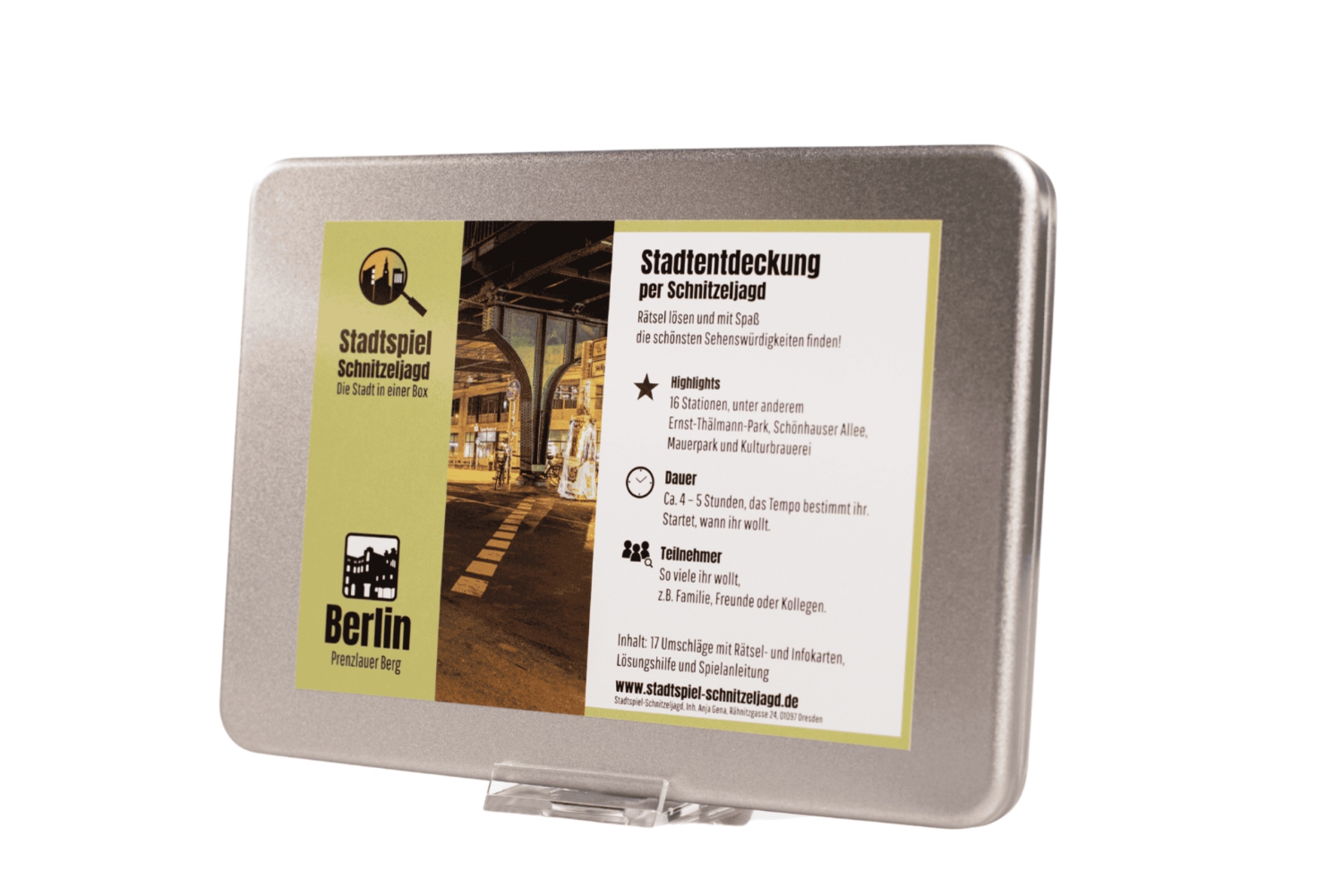 - You will receive the scavenger hunt box via mail. Please note that the shipping can take up to 4 working days (within Germany). Please make sure you provide a shipping address. The scavenger hunt can be experienced after you received the box, regardless of the selected date and time. A pickup of the box in Berlin is not possible!
